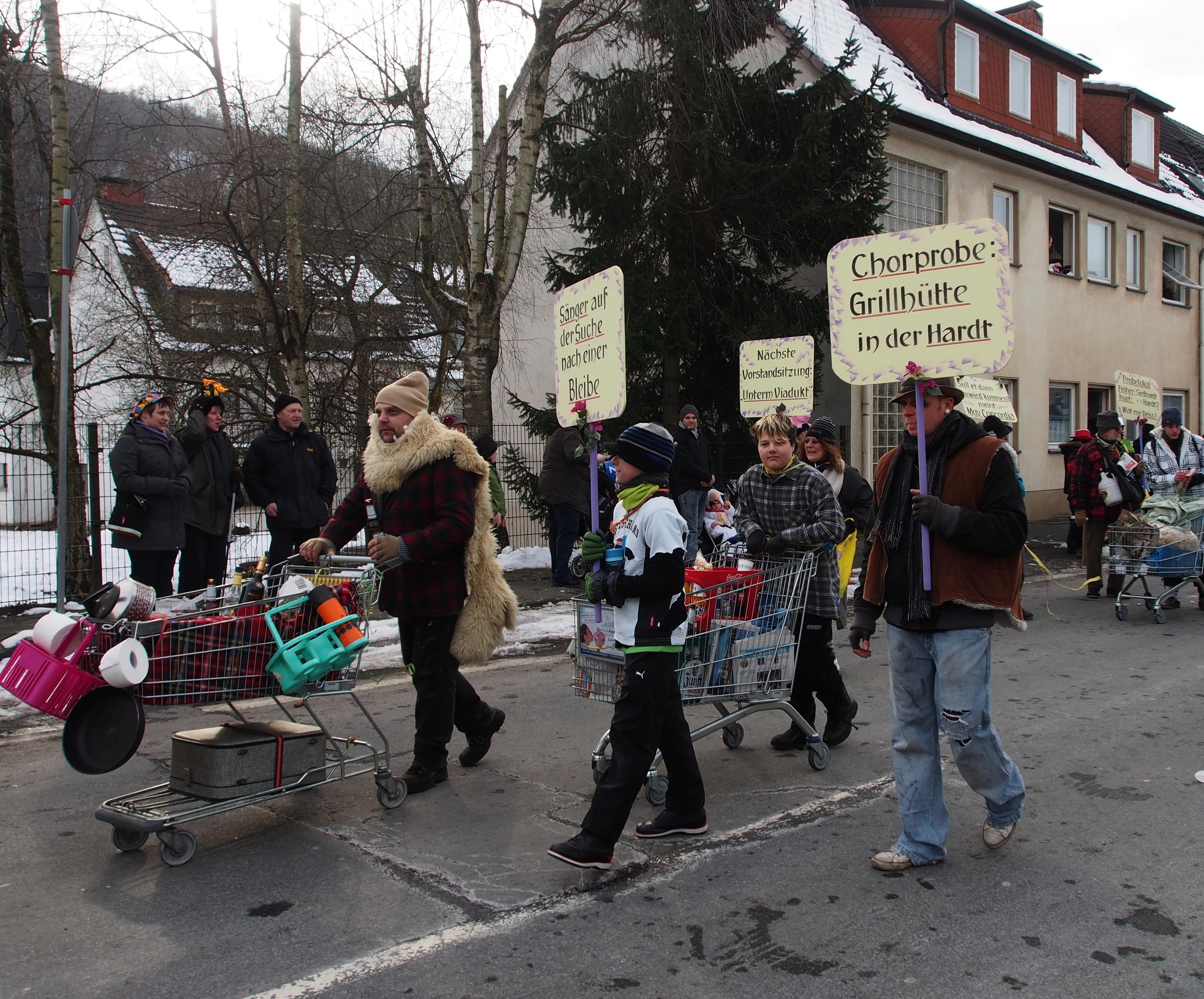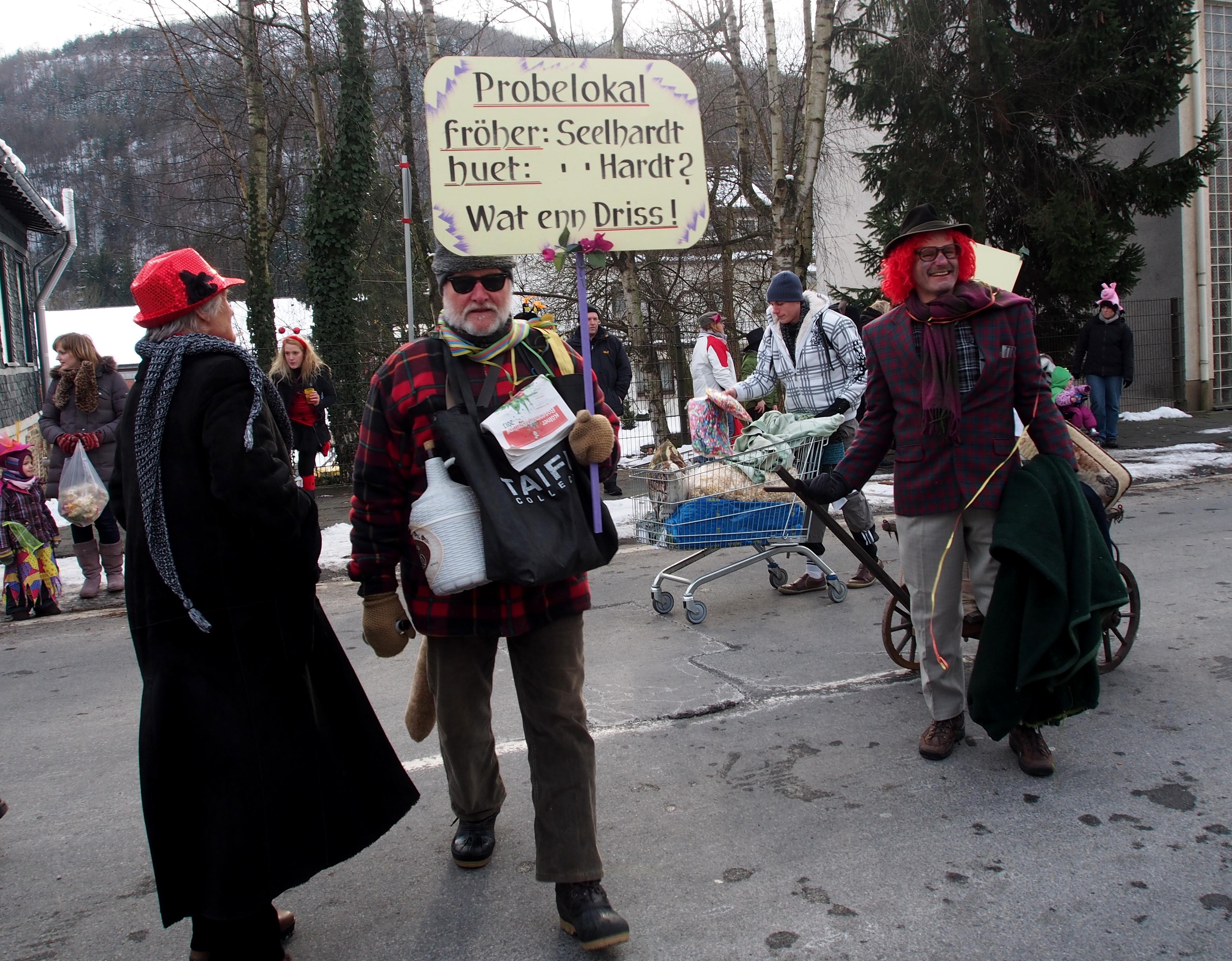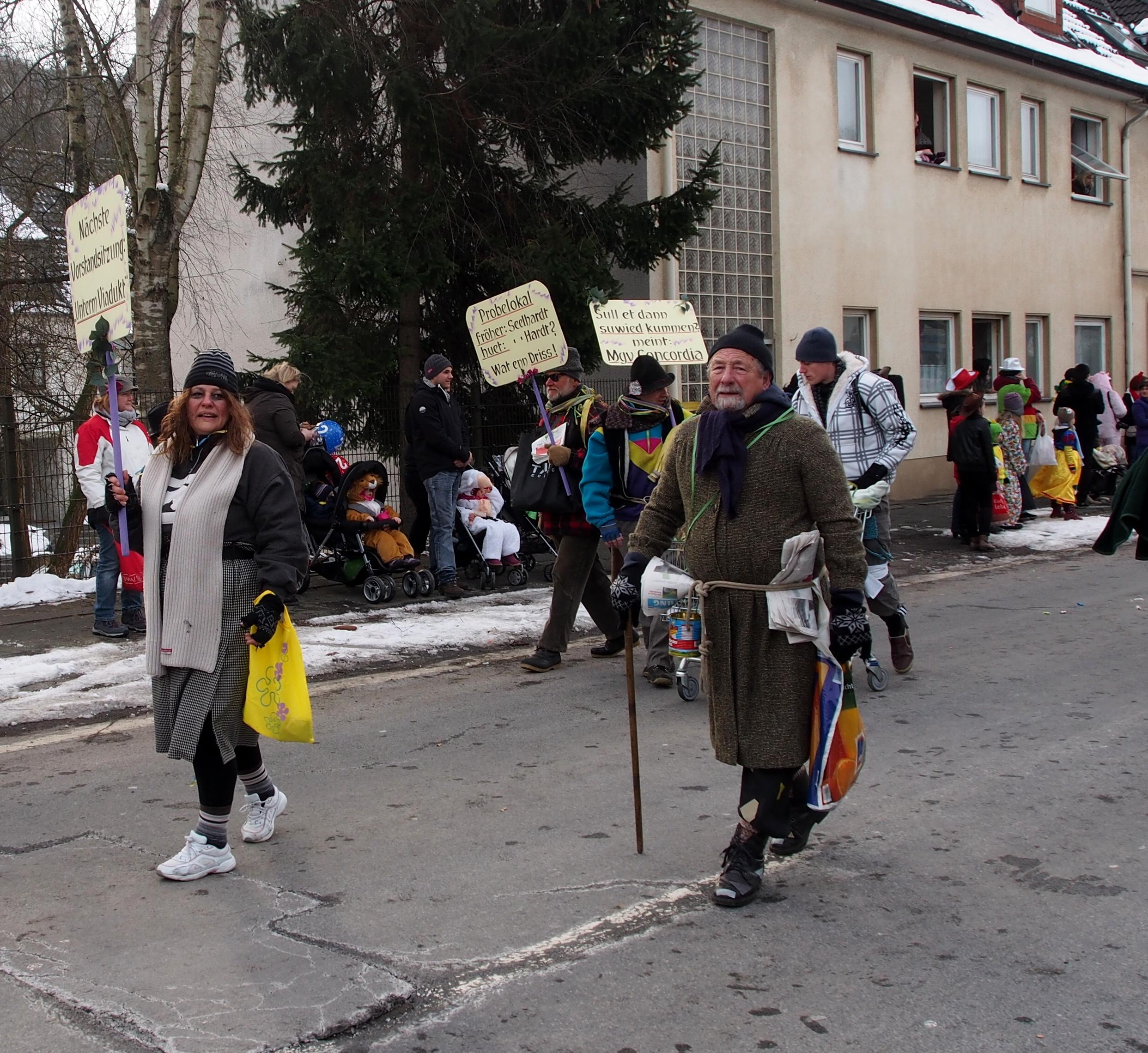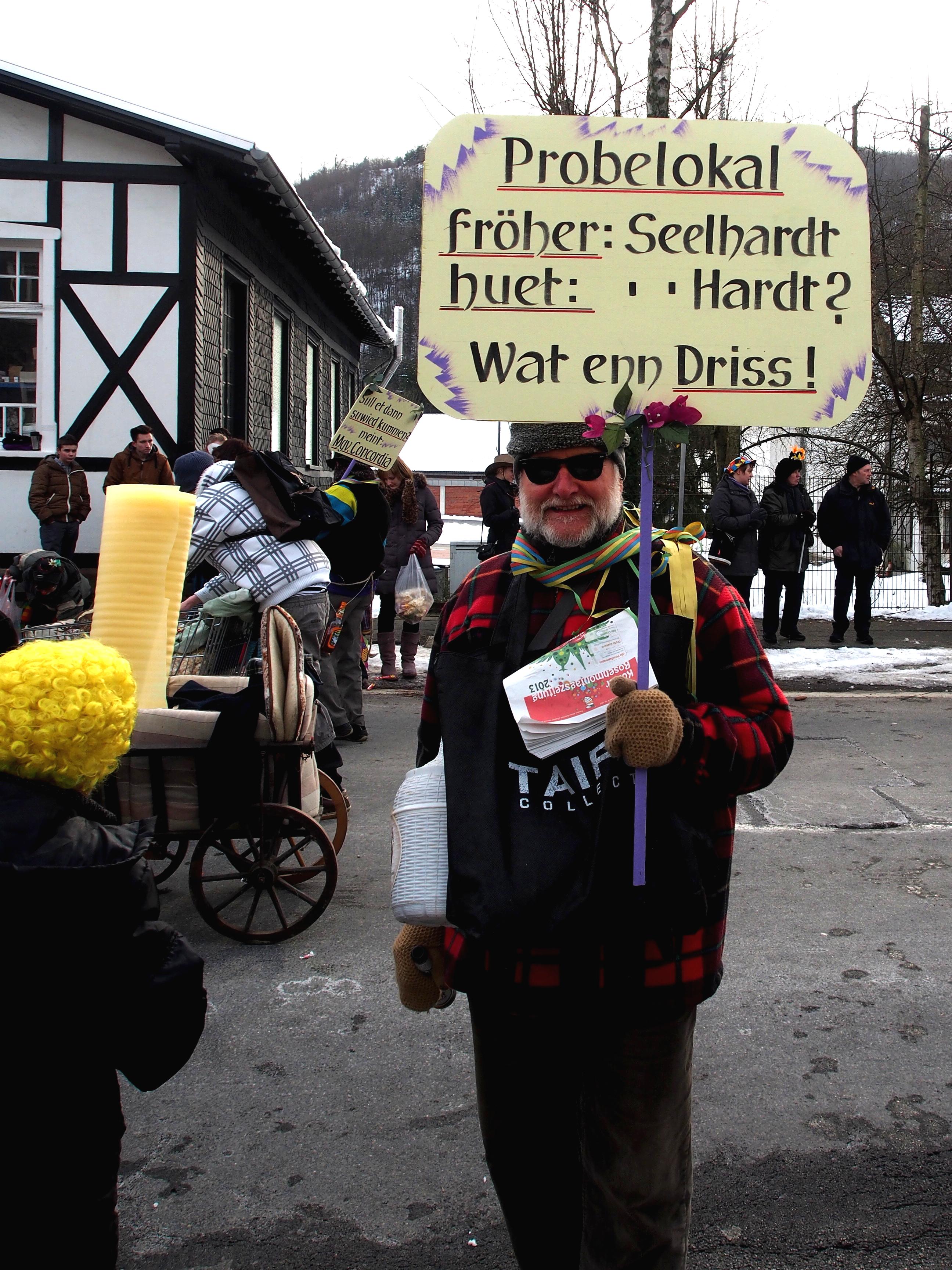 „Chorproben in der Grillhütte“, oder „Probelokal fröher Seelhardt, huet in der Hardt, wat ein Driss“, „Vorstandssitzungen unterm Viadukt“, so stand es in echt Muerschbecher Platt in großen Lättern auf den Schildern der malerischen Fußgruppe des MGV „Concordia“ Morsbach beim diesjährigen Rosenmontagszug in der „Republik“. Die Truppe, mit Ehrenvorsitzenden Walter Moll an der Spitze, prangerte mit ihrem Motto die derzeitige Probenlokalmisere des Chores an. Nachdem das bisherige Probenlokal „Seelhardt“ ohne Pächter ist, müssen die Sänger des Öfteren ihr Probendomizil wechseln. Derzeitig haben sie eine vorläufige Bleibe in der Sportlerklause „Nr. 9“ gefunden. Die „Concordia-Fußgruppe“ mit Walter Moll, Mario Hermann, Norbert und Alexander Kötting. Heinz Gossmann (Gossi). Guido und Tobias Bork, Jutta Moll-Bork und Stefan Bimberg nahmen diese Odyssee zum Anlass, die Öffentlichkeit auf diese Misere humorvoll hinzuweisen. Die zahlreichen Zuschauer verstanden die Sorgen der Sänger und zollten der Fußgruppe viel Beifall.