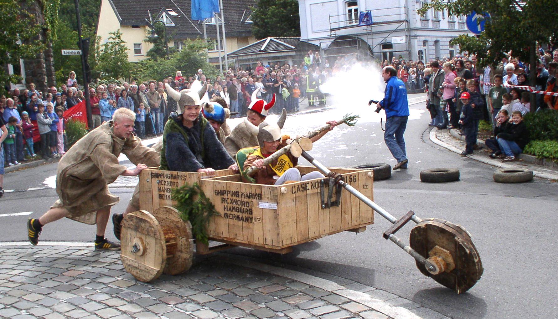 Das traditionelle Schubkarrenrennen am Kirmessonntag war wieder der Höhepunkt der viertägigen Morsbacher Kirmes. Bestens vom Heimatverein Morsbach organisiert und vorbereitet wurde das Spektakel zu einem ganz besonderen Erlebnis für die zahlreichen Zuschauer an der Rennstrecke. Es mögen schon mehrere Tausend Besucher gewesen sein, die dicht gedrängt in der Ortsmitte, die in verschiedene Klassen aufgeteilten, Rennläufe verfolgten. Darunter auch ein Rennstall des MGV „Concordia“ Morsbach.