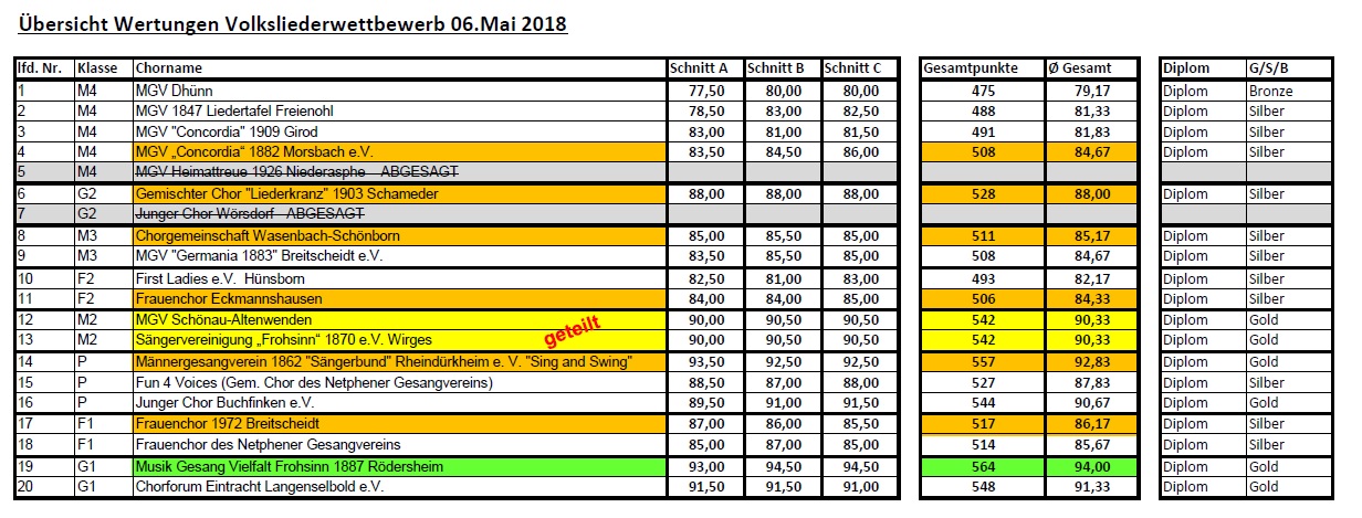 Mit der höchsten Punktzahl in dieser Klasse wurde dem Chor von den beiden Wertungsrichtern der erste Klassenpreis und der erste Dirigentenpreis zugesprochen. Zum Vortrag kamen die Lieder „Kein schöner Land“ mit dem Baritonsolo von Heinz Stockhausen, „Wolga“ und „Soon Ah Will BE Done“. Groß war natürlich die Freude, als am späten Nachmittag im Festzelt in der Wisseraue das Ergebnis bekannt gegeben wurde. Vorsitzender Heinz Stockhausen​​ und der 2. Geschäftsführer Peter Ozolins nahmen Urkunde und Preisgeld entgegen. Dieser großartige Erfolg wurde natürlich von den Sängern noch gebührend gefeiert. Auch Chorleiter Hubertus Schönauer war noch aus Ottfingen gekommen, um mit seinen Sängern auf den schönen Erfolg anzustoßen.