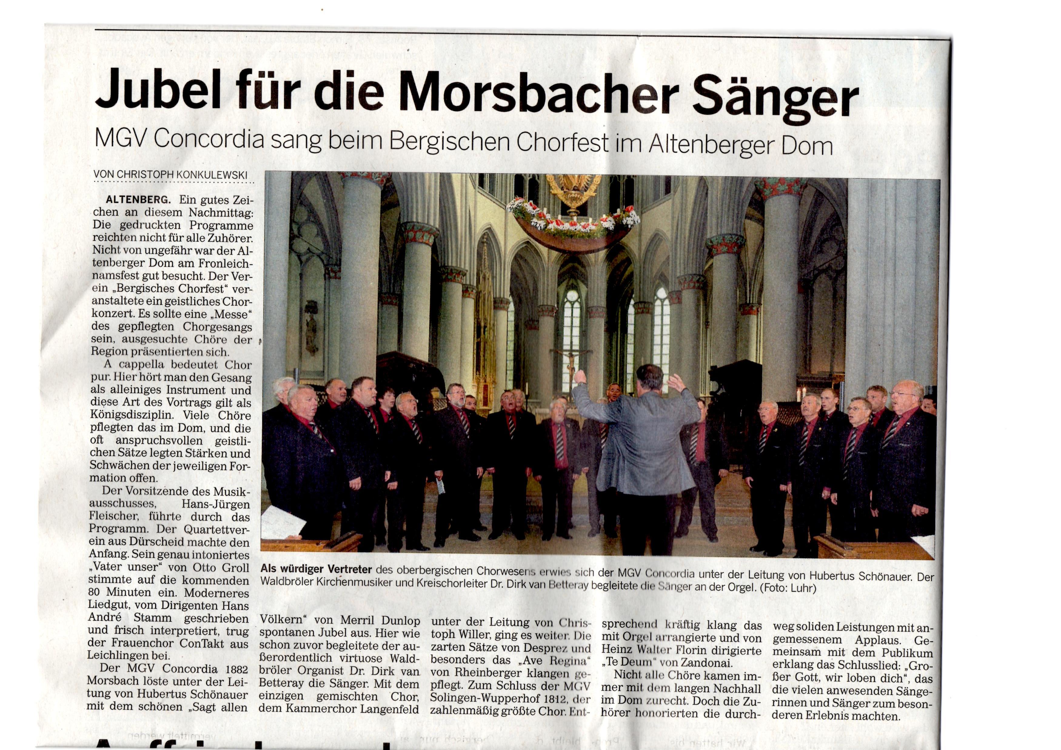 Morsbach. Es ist schon etwas Besonderes in einer großen Kathedrale vor einem fachkundigen Publikum zu musizieren. Der MGV „Concordia“ Morsbach hatte jetzt am Fronleichnamstag diese Gelegenheit beim bergischen Chorfest im, mit über 600 Personen, vollbesetzten Altenberger Dom. Mit weiteren vier hervorragenden Chören aus dem bergischen Raum konnten die „Concordia-Sänger“, unter der Leitung von Hubertus Schönauer, mit den vier vorgetragenen Liedern, die große Zuhörerschar voll überzeugen.