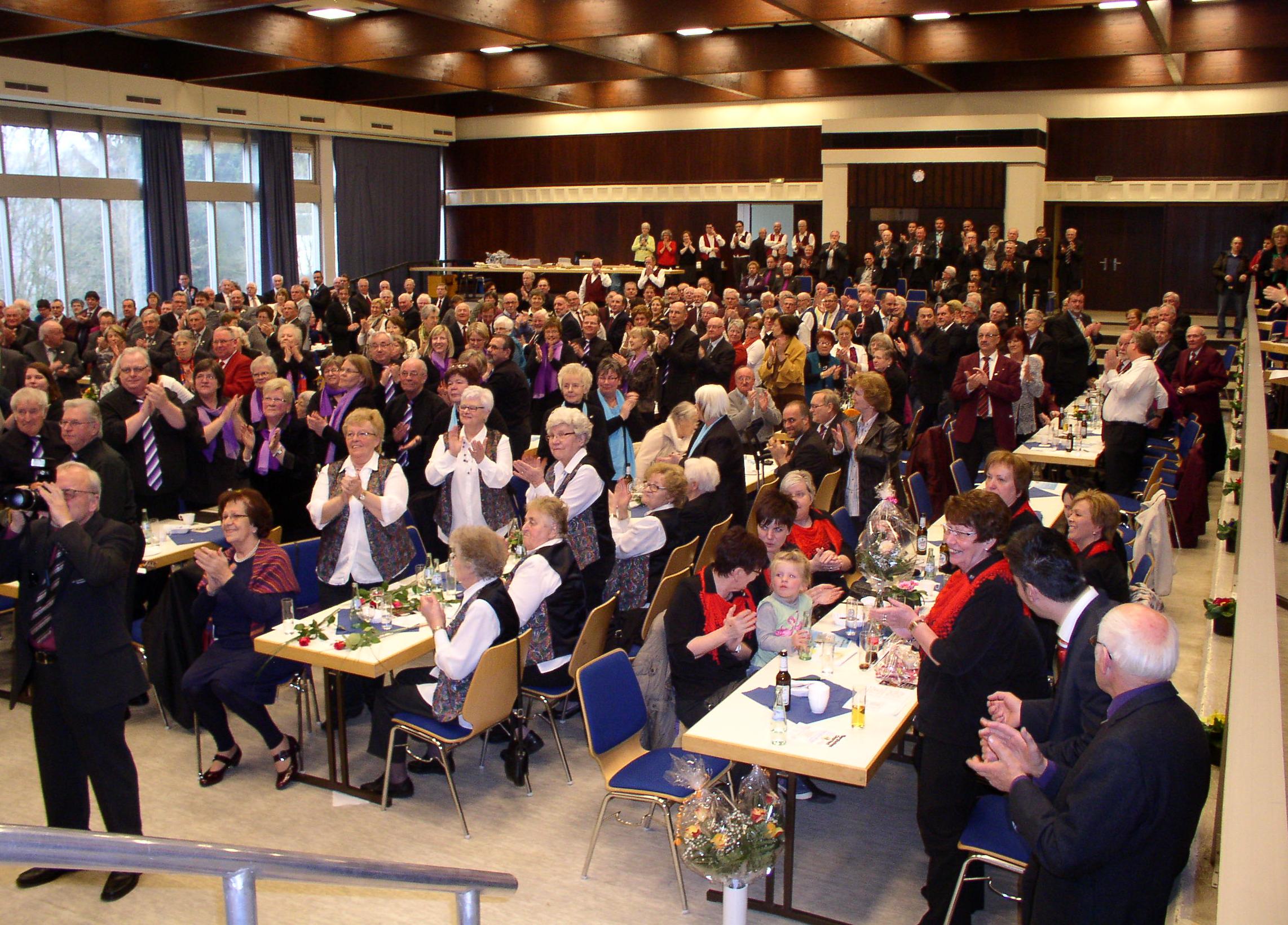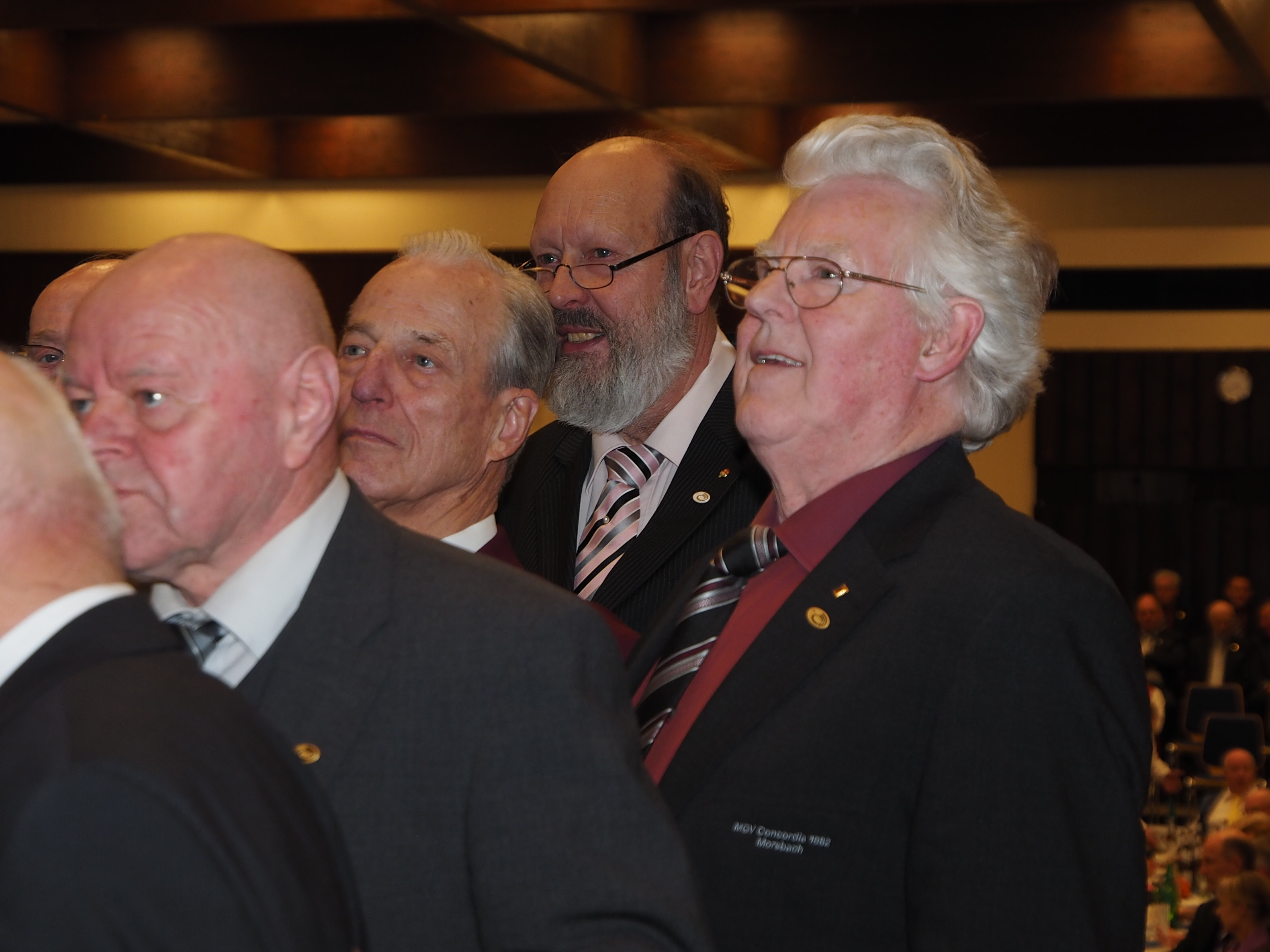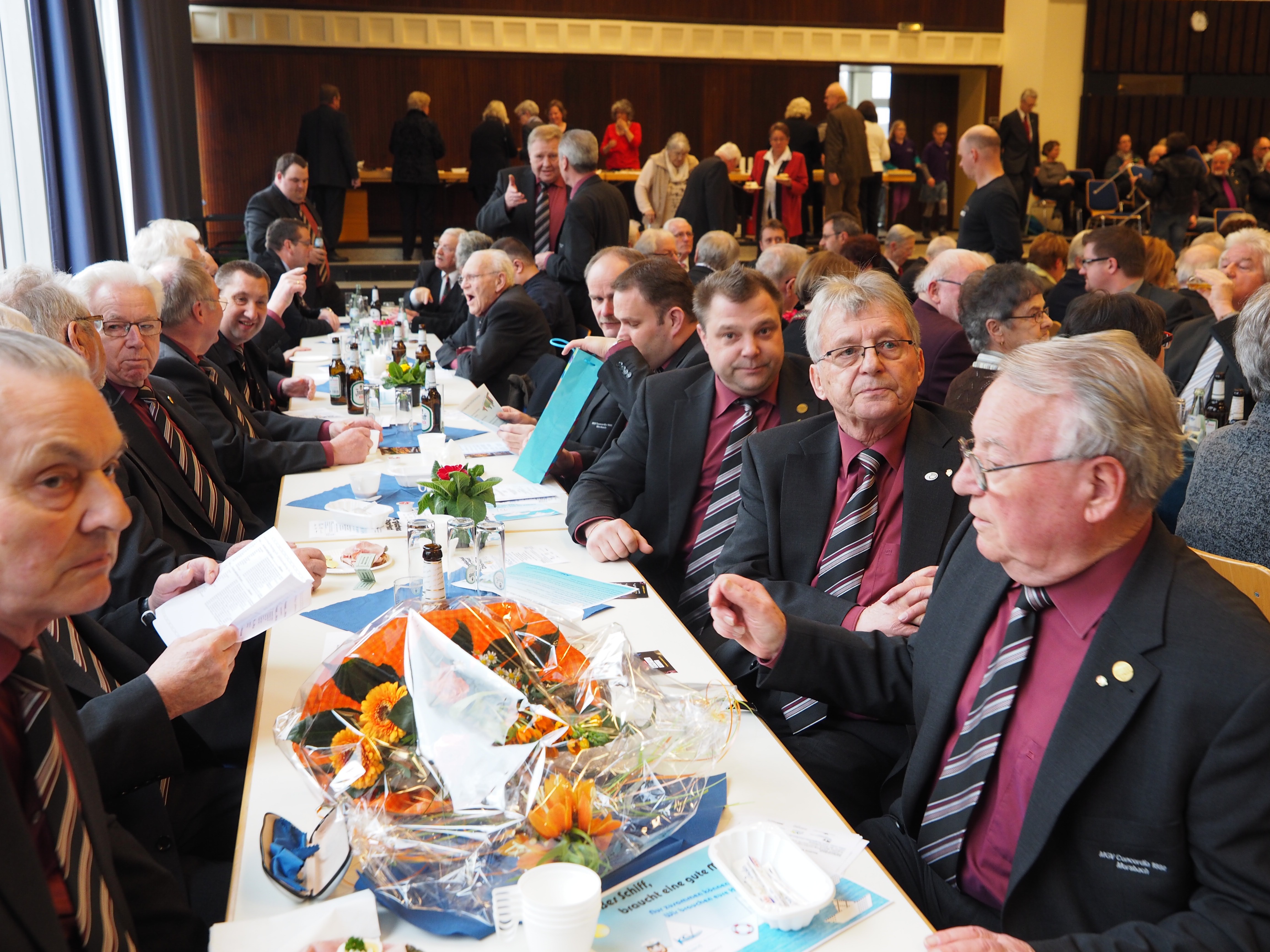 Morsbach. Bei der großen zentrale Jubilarenehrung des Chorverbandes Oberberg in Bielstein wurde auch ein verdienter Sänger des MGV „Concordia“ Morsbach ausgezeichnet. Stefan Koch (1. Tenor) singt nun schon seit 65 Jahren in seinem MGV „Concordia“ Morsbach. Er gehörte, genau wie Ehrenvorsitzender Walter Moll, in der ersten Stunde nach dem zweiten Weltkrieg, zu den Sängern, die den Chor wieder aufbauten und mit ihrer Stimme auch zu gesanglichen Leistungen führten. Gerne erinnert sicht Stefan Koch heute an diese Zeit zurück. Der unvergessene Morsbacher Willi Busch hatte 1948 die musikalische Leitung der „Concordia“ übernommen. Schnell schlossen sich auch die Sänger wieder dem Chor an, die aus dem Krieg zurück gekehrt waren. Willi Busch brachte die „Concordia“ schnell auf ein hohes Leistungsniveau, so das auch die ersten Erfolge bei Gesangwettstreiten nicht ausblieben. Inzwischen hat Stefan Koch sieben Chorleiter in der „Concordia“ erlebt. Mit Peter Sonntag (1980, 1985) Gerhard Schneider (1991.1996), dem Aushilfsdirigenten Michael Busch aus Soest (2002), Thomas Bröcher (2007) und Hubertus Schönauer (2012) konnte er auch mit dem Chor sieben Meisterchortitel im Chorverband NRW erringen. Auch heute noch zählt der 82 jährige mit seiner Tenorstimme zu den Stützen des MGV „Concordia“ Morsbach. Stefan Koch hat viele Jahre im Vorstand gearbeitet. War zweiter Vorsitzender und seine stets ruhige Art, seine sachliche und ausgeglichene Meinung genießen im Verein immer noch große Wertschätzung. Chorverbandsvorsitzender Friedrich Steinberg überreichte ihm die goldene Ehrennadel mit Urkunde des deutschen Sängerbundes. Auch Vereinsvorsitzender Heinz Stockhausen und die mitgereisten Vorstandsmitglieder gratulierten den treuen Sangesbruder und überreichten ein Erinnerungsgeschenk.